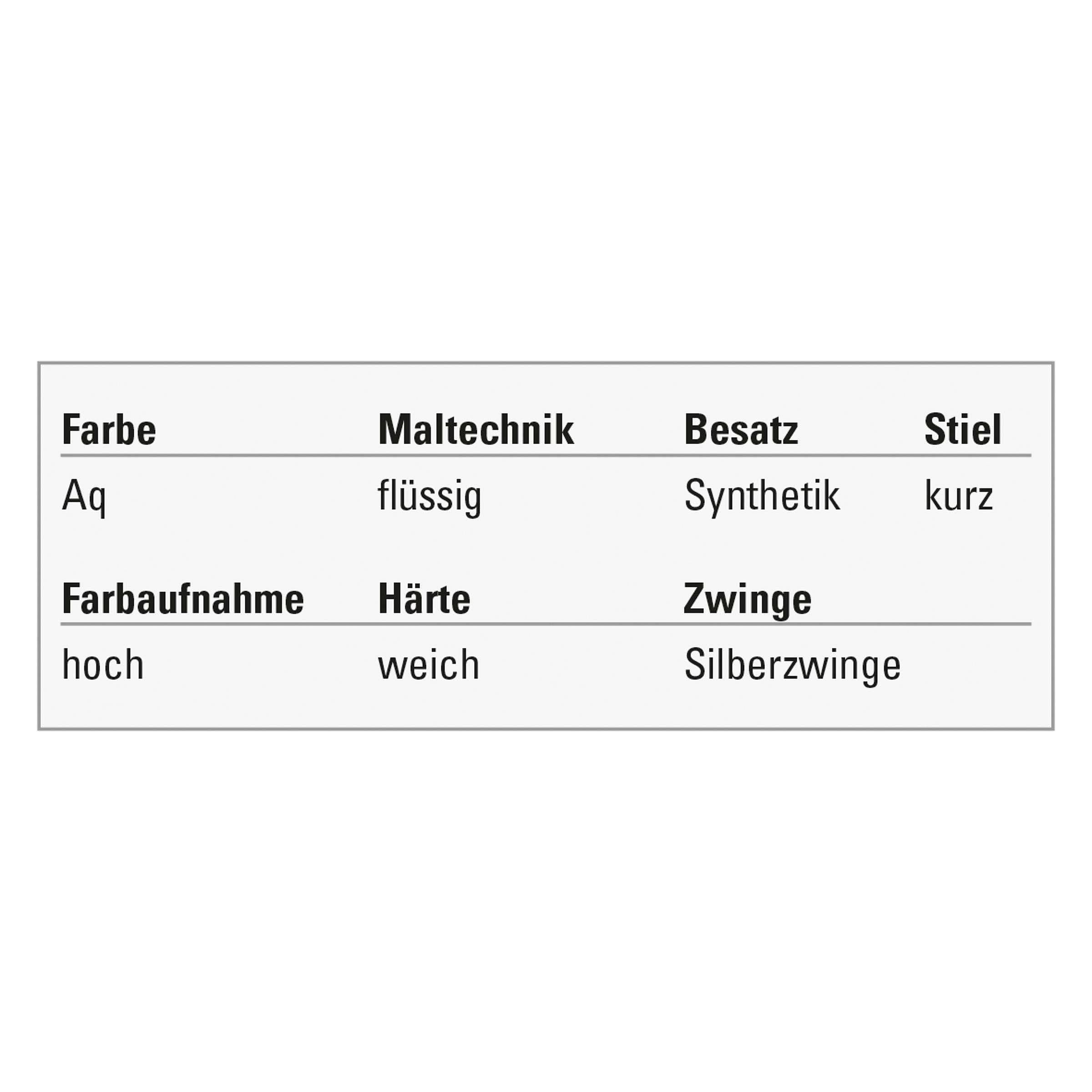 Aquarellpinsel mit synthetischem Taklon-Besatz. Die braune Faser hat eine hohe Farbaufnahmekapazität und ist ideal für die Arbeit mit sehr flüssiger Farbe geeignet. Beim Malen wird diese gleichmäßig abgegeben. Die exakt gearbeitete Spitze ist bei guter Pflege besonders formstabil. Mit Silberzwinge und schwarz lackiertem Holzstiel.