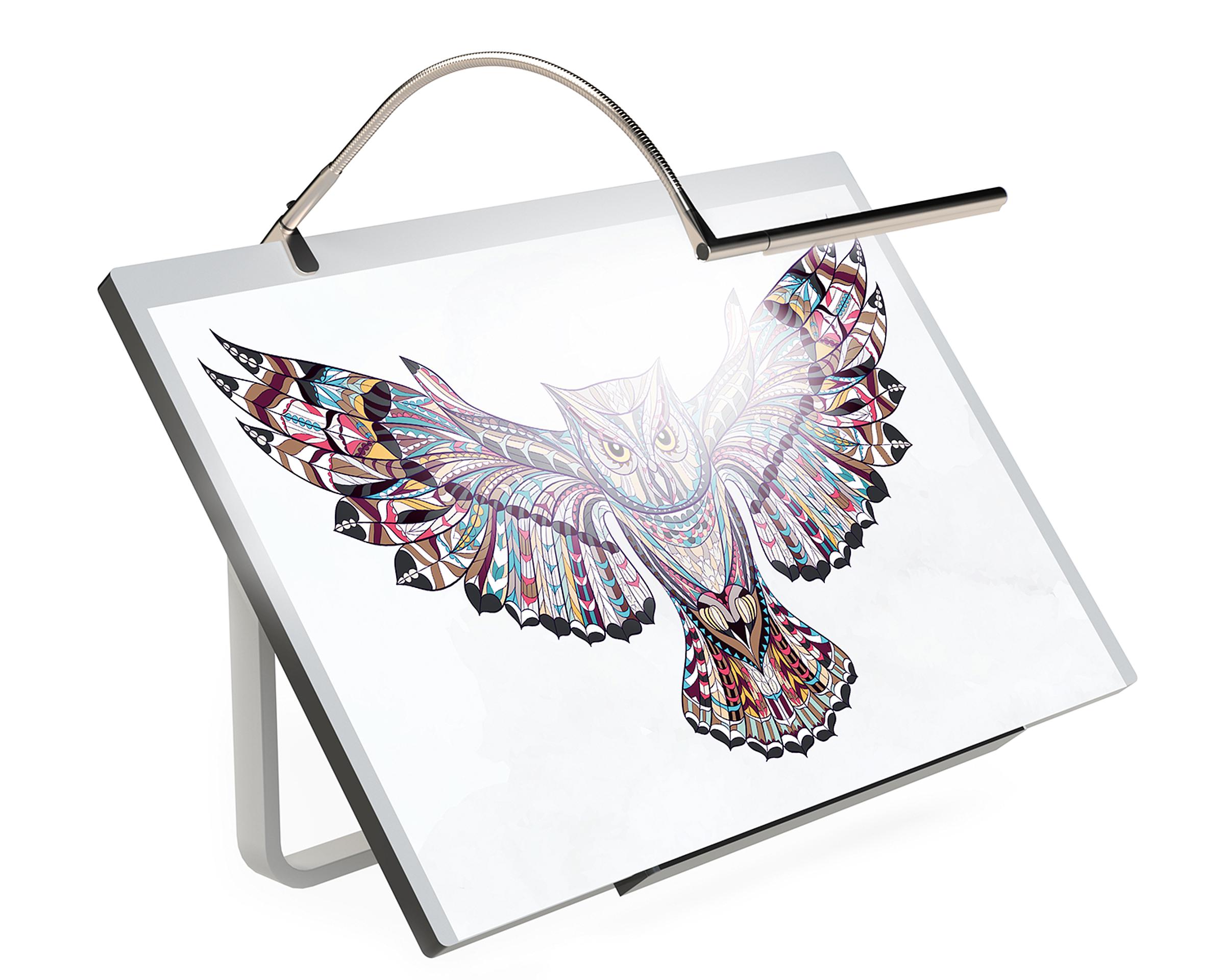 Die anspruchsvoll gestaltete Leuchte aus gebürstetem Stahl wurde speziell zur Montage an Staffeleien, Zeichentischen o. Ä. entwickelt. Die hellen daylight-LEDs sind in drei Helligkeitsstufen regulierbar und erlauben eine perfekte Farbabstimmung. Der flexible Gelenk-Schwenkarm lässt sich für eine exakte, individuelle Ausleuchtung um 360°drehen. Zusätzlich ermöglicht ein 320°-Schirm-Schwenkmechanismus eine Lichtabdeckung für Leinwände oder andere Malgründe bis zum Format A1. Inklusive Leuchtmittel, Staffelei-Klemme aus Metall und universeller Zeichentisch- oder Reißbrettklemme. Lebensdauer: 50.000, LED 822 Im, 3.000 Lux/30 cm Abstand, Lichtfarbe 6.000 Kelvin, CRI 90+, inkl. Leuchtmittel, Energieverbrauch 12 kWh/1000h.