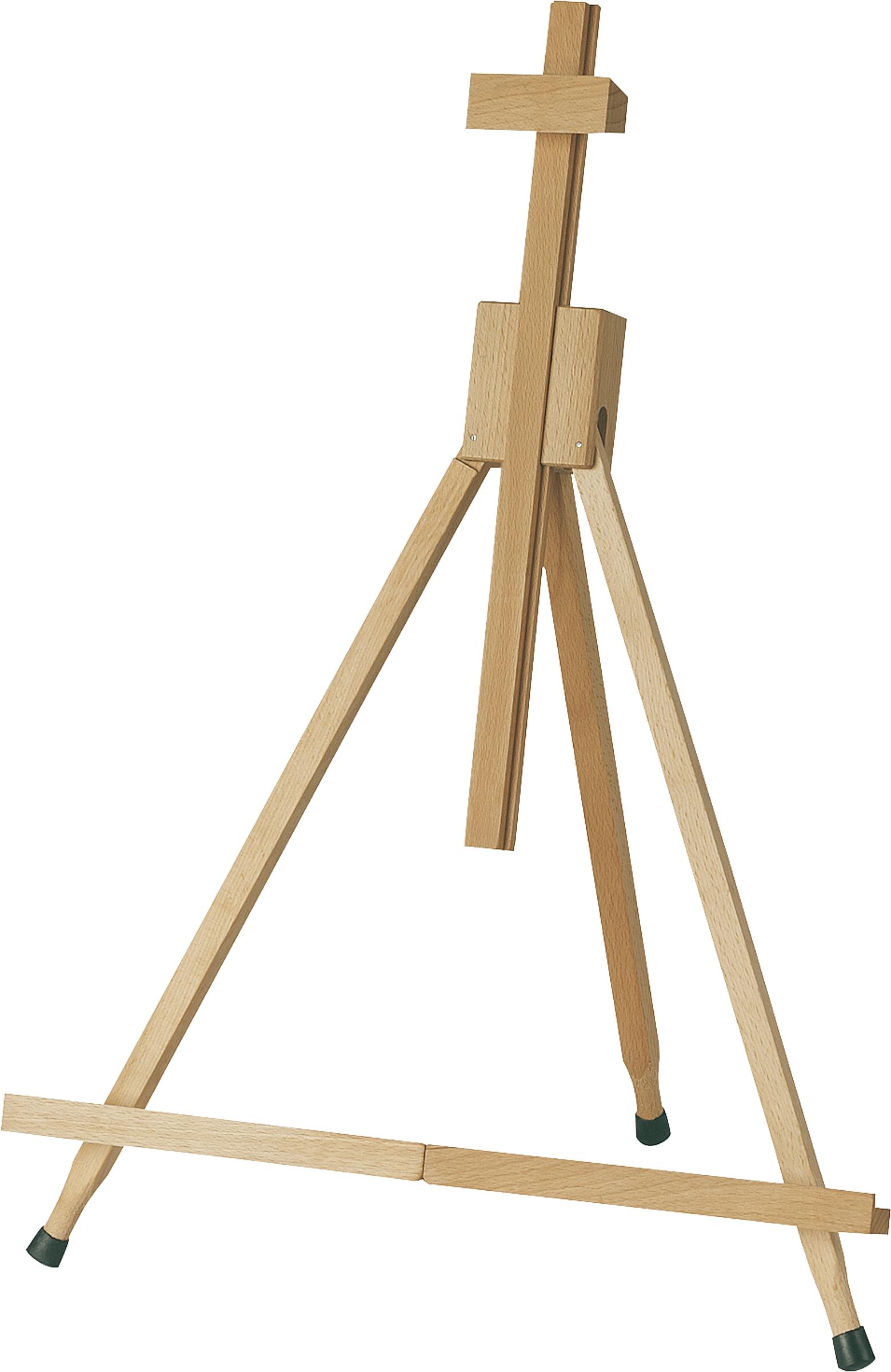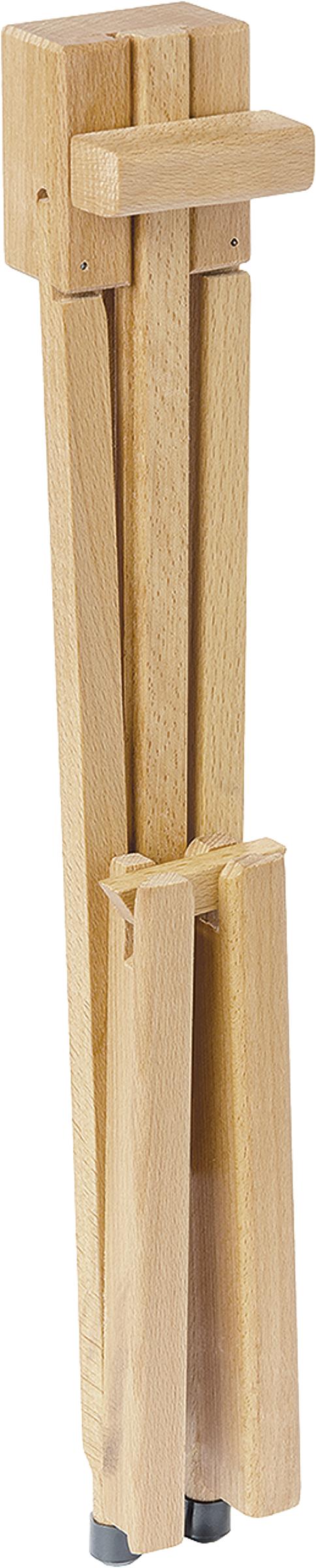 Aus Buchenholz. Auf Taschenformat zusammenklappbare Tischstaffelei. Höhenverstellung des Bildhalters durch Schraubbefestigung. Gummistopper gewährleisten eine gute Standfestigkeit. Sehr günstiger Preis.