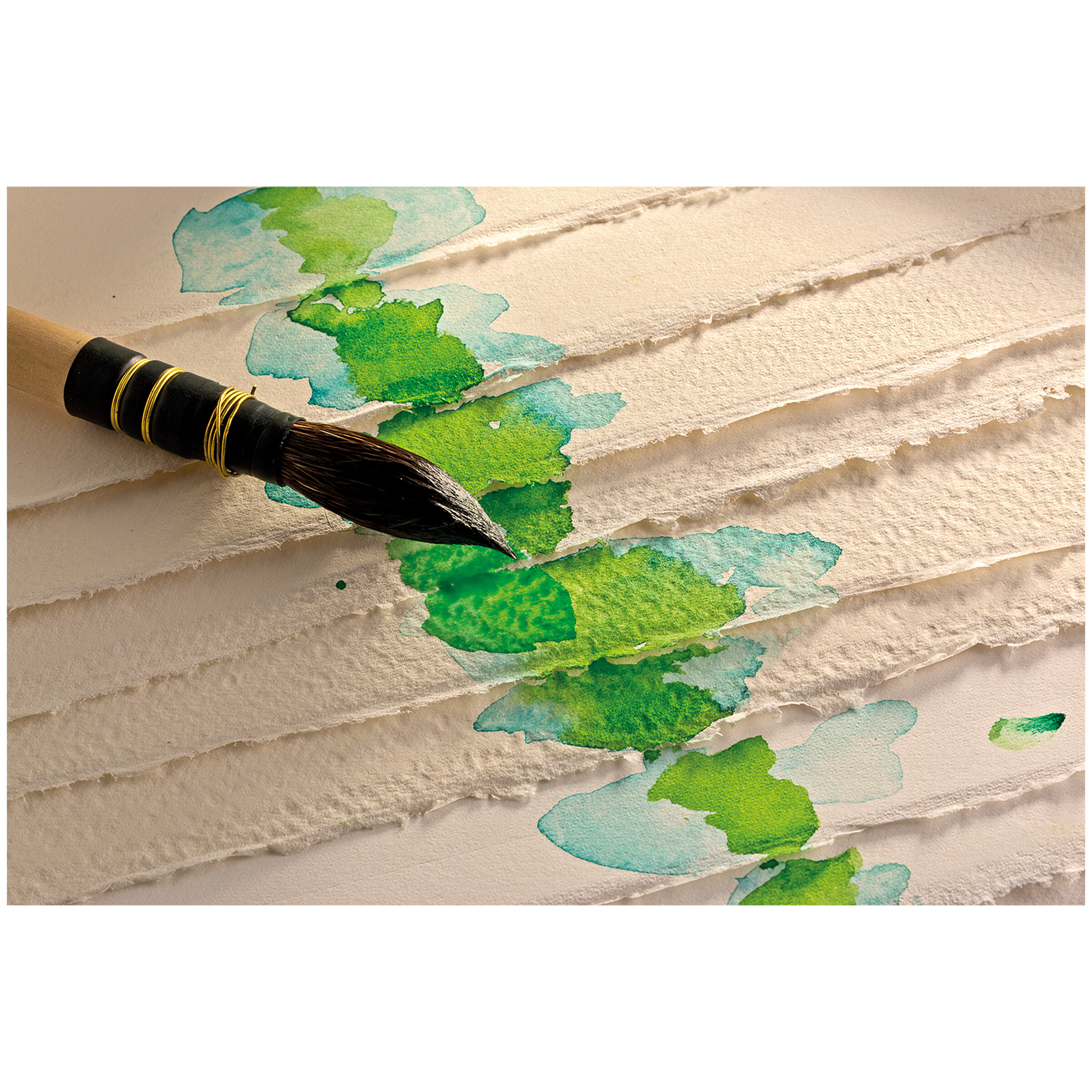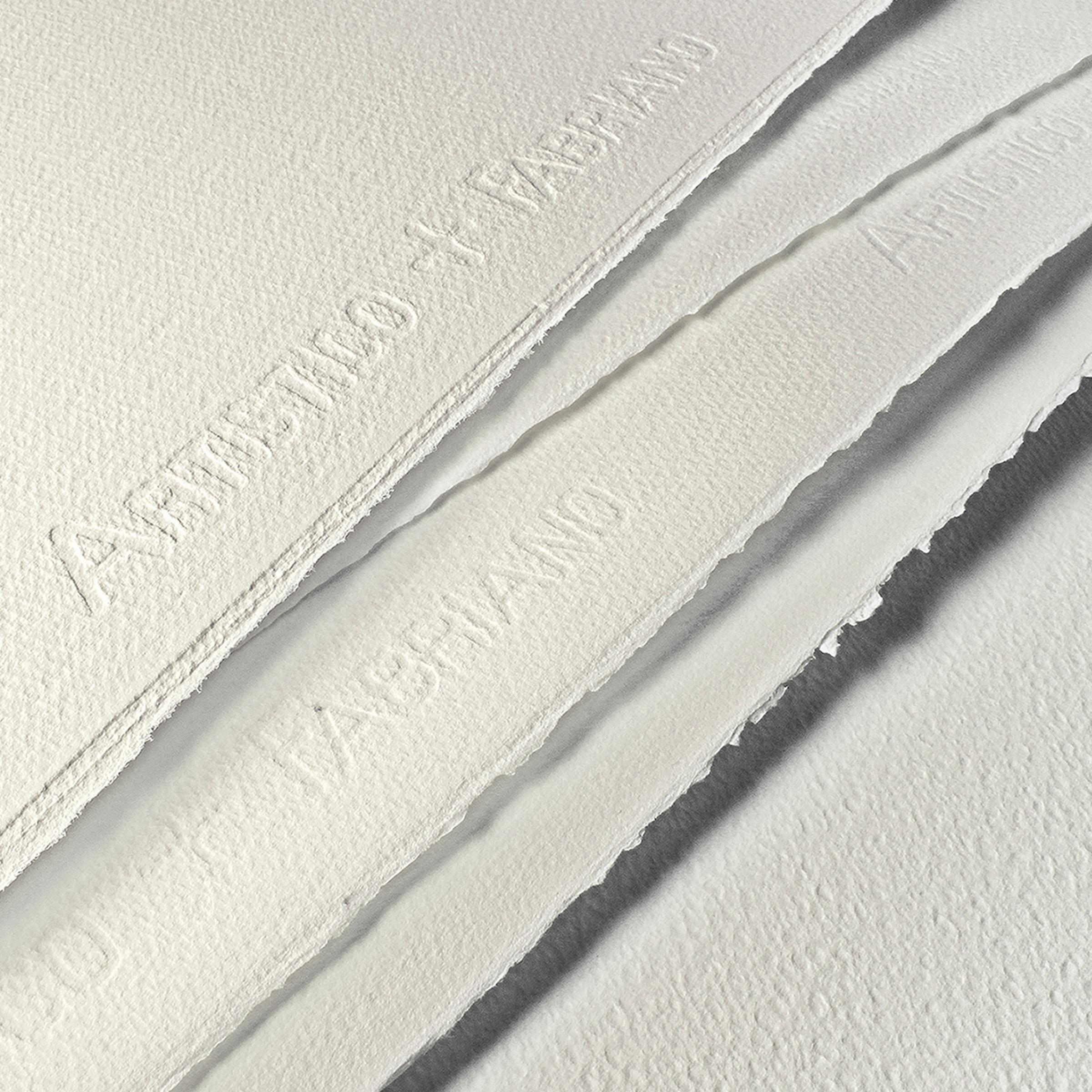 Sehr hochwertiges naturweißes Papier aus 100 % Baumwolle, vierseitige Büttenränder, keine optischen Aufheller, alterungsbeständig, chlor- und säurefrei, pH-neutral, sehr saugfähig und vegan, stoff- und obeflächengeleimt. Die verbesserte Oberflächenleimung macht das Papier noch widerstandsfähriger. Es ist gut einsetzbar für das Abnehmen und Korrigieren von Farbe sowie für die Kratztechnik. Erhältlich mit 300 g/m² in 3 Oberflächen: Grobkörnig, feinkörnig und satiniert und mit 640 g/m² in 2 Oberflächen: Grob- und feinkörnig, wobei das Papier von grobkörnig zu satiniert immer weniger strukturiert ist. Ideal für Aquarellfarben, Gouache, Acrylfarben, Tinte, Kohle- und Bleistiftzeichnungen.