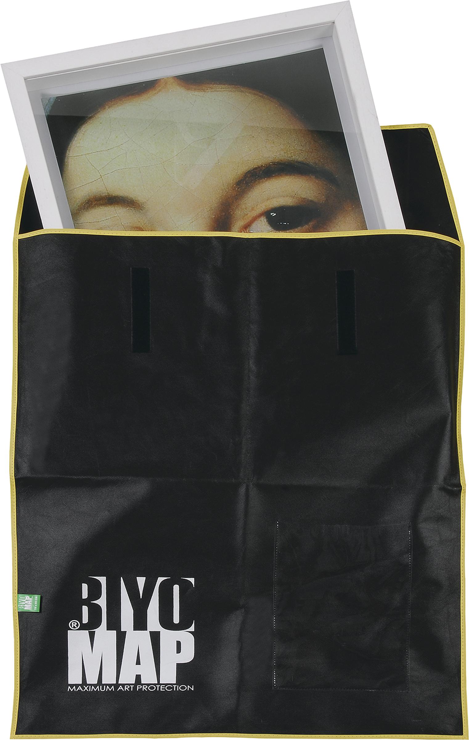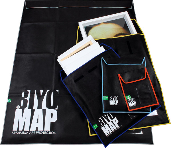 Maximaler Schutz in elegantem Design: Ob für den Transport oder zur sicheren Auf­bewahrung von Bildern und Zeichnungen – Biyomap ist die umweltfreundliche Alternative zu herkömmlichen Verpackungsmaterialien. Auch bei einer längerfristigen Lagerung bieten die schwarzen Hüllen den idealen Schutz: Aus Recyclingmaterial hergestellt, sind sie säurefrei, wasserabweisend, aber trotzdem atmungsaktiv und kratzfest. Sie sind wiederverwendbar und lassen sich bei Nicht­gebrauch platzsparend zusammen­falten. Biyomap-Hüllen sind leicht und bequem in der Handhabung. Durch die separat lieferbaren Tragegurte sind sie leicht zu transportieren, und durch den Klettverschluss schnell verschließbar. Sieben verschiedene Größen sind erhältlich – jede Größe ist durch einen farbig abgesetzten Rand markiert. Alle Hüllen sind außen mit transparentem Info-Fach im DIN A4-Format versehen – hier finden alle wichtigen Informationen zum Inhalt Platz. Nicht über längere Zeit Hitze oder UV-Strahlung aussetzen.
