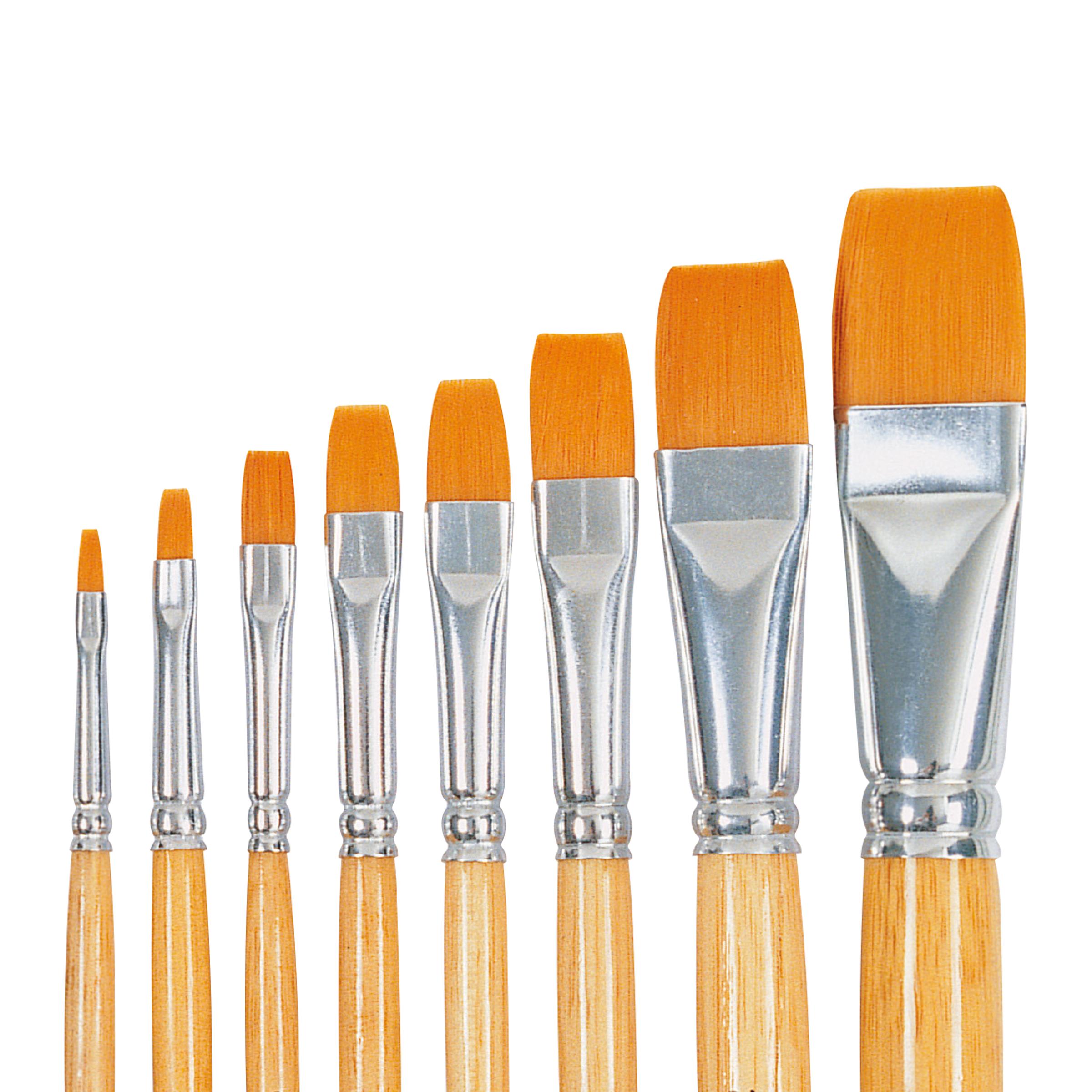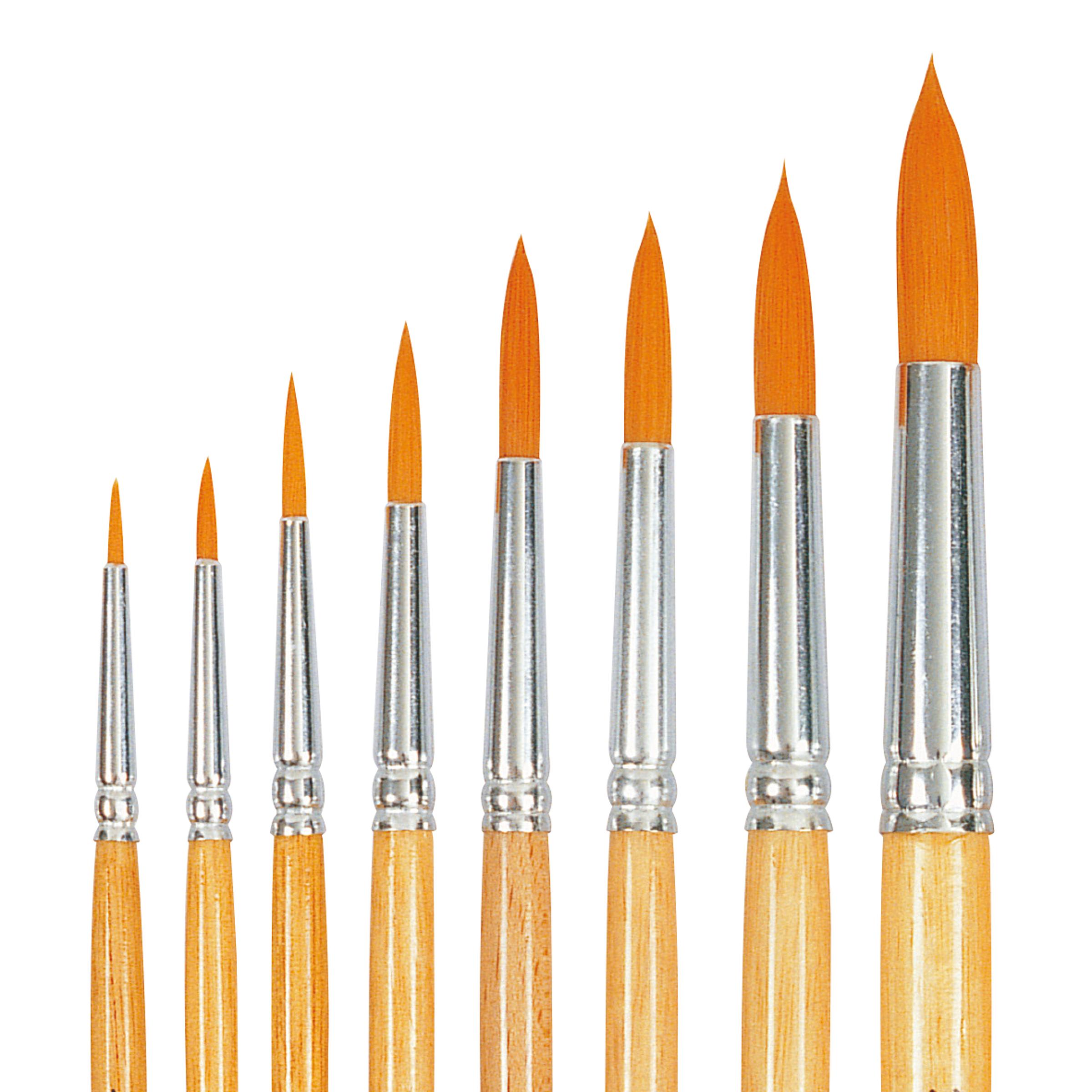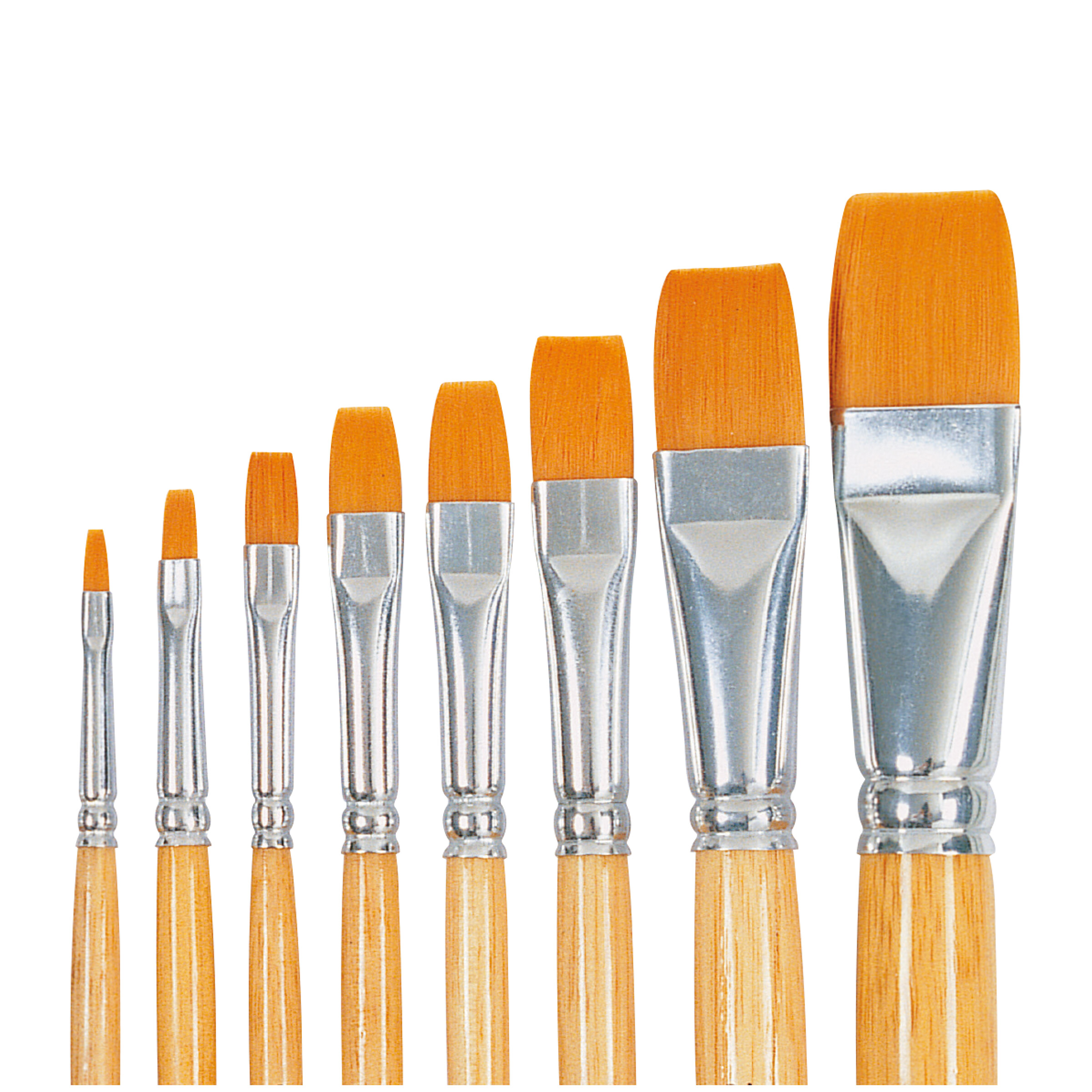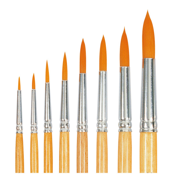 Rund- und Flachpinsel mit robusten, elastischem goldfarbenen Synthetikhaar, kurzem, naturlackiertem Stiel und Aluzwinge. Geeignet für Arbeiten mit Aquarellfarbe, Gouache, Acryl- und Ölmalfarbe.