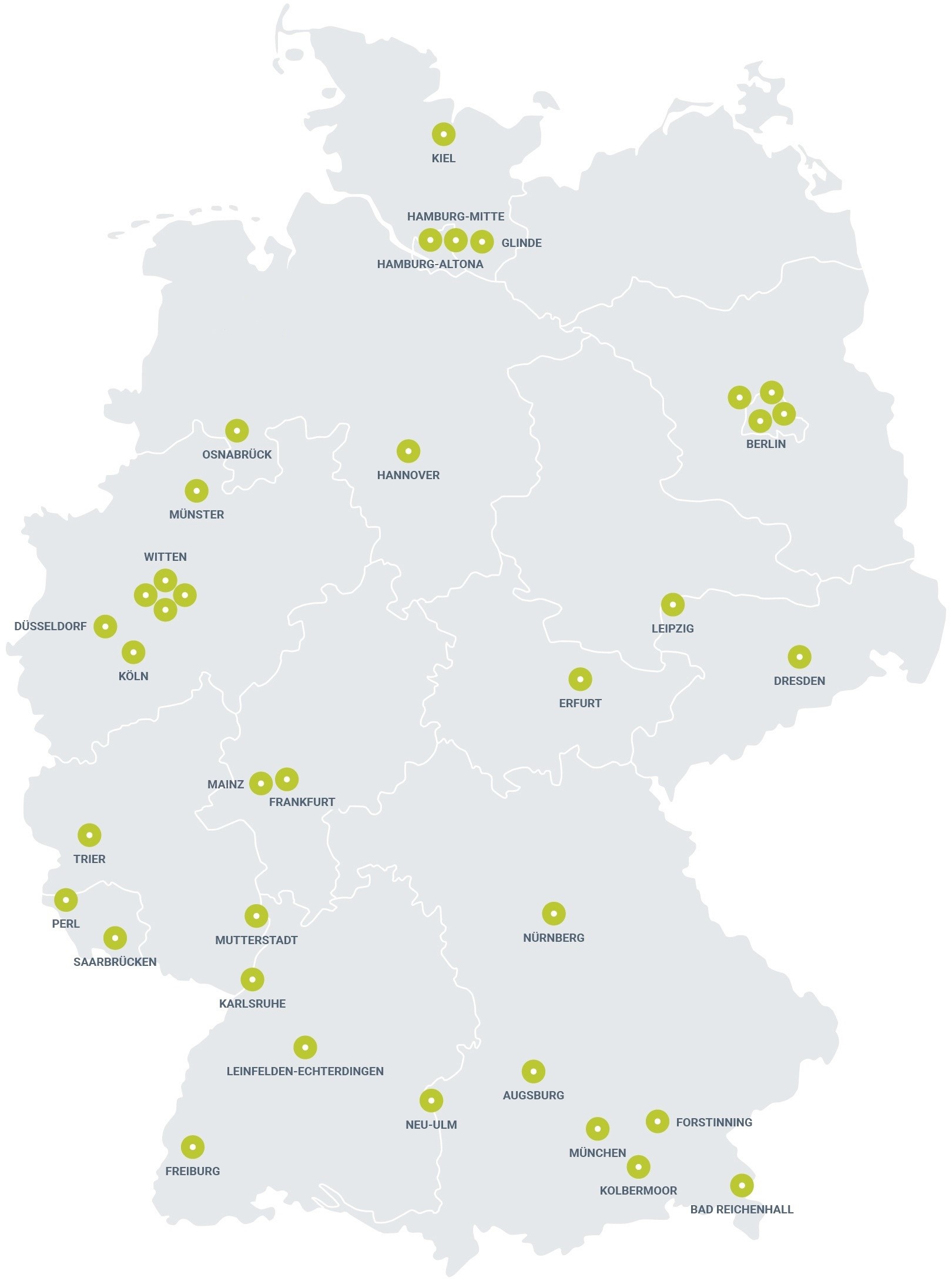 Die Niederlassungssuche finden Sie hier. Auf die Seiten der einzelnen Niederlassungen mit weiteren Informationen, Öffnungszeiten, Kontaktmöglichkeiten, Veranstaltungen und Aktionen vor Ort gelangen Sie auch per Klick auf die Karte.