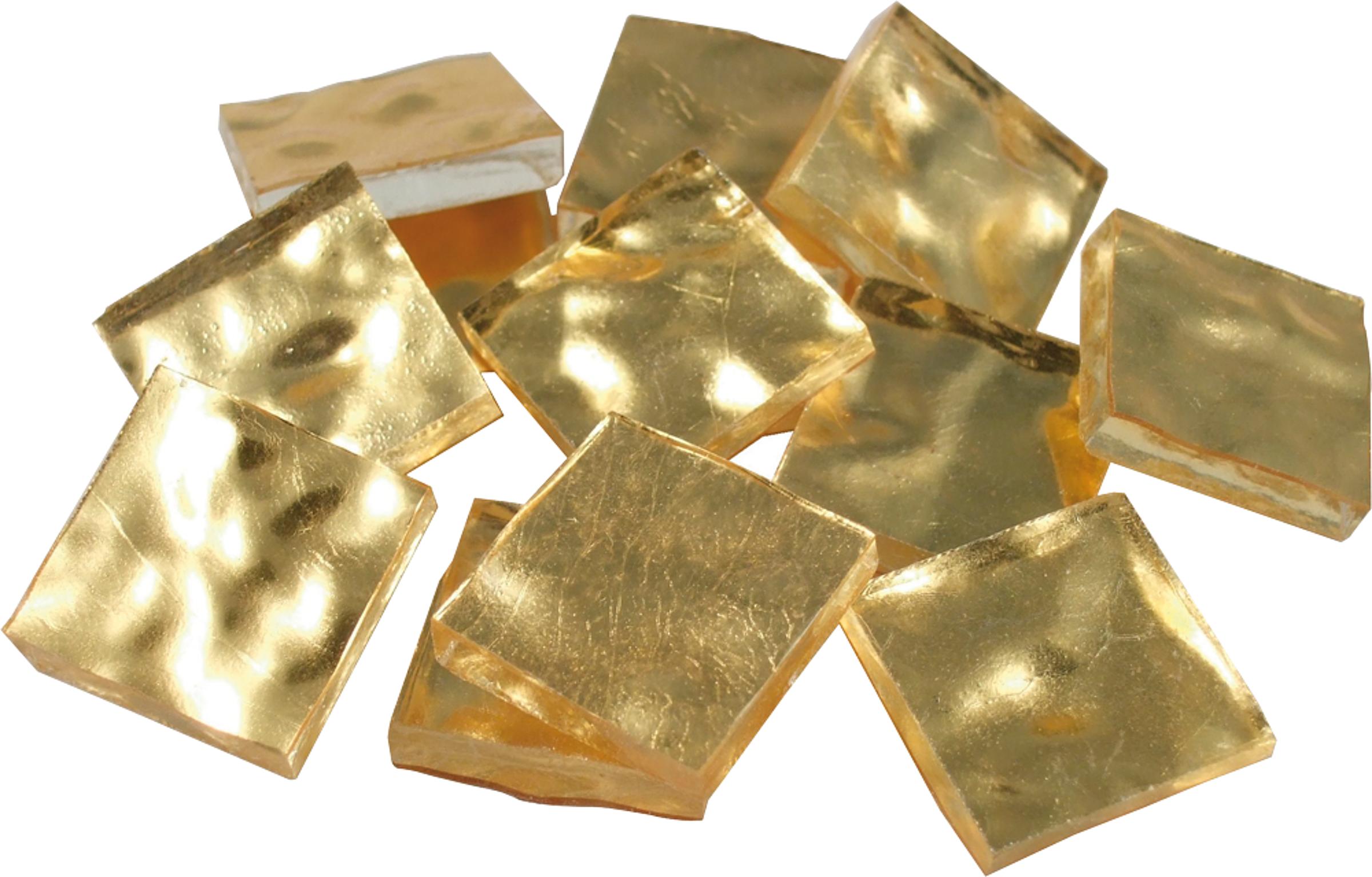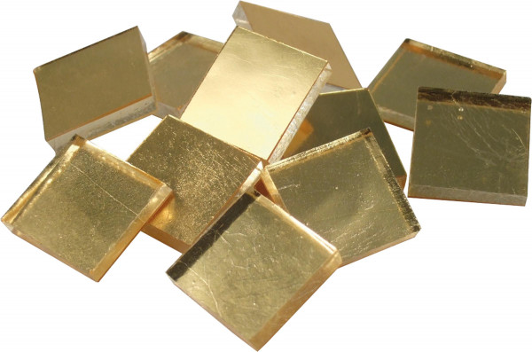 Venezianisches Goldmosaik wird seit Jahrhunderten in kleinen Manufakturen per Hand hergestellt. Echtes 24 kt Blattgold wird in einem aufwändigen Verfahren zwischen zwei unterschiedlich dicken Glasplättchen geschmolzen. Goldmosaik kann beidseitig verwendet werden. Für Bodenmosaik empfehlen wir, die Seite mit dem dickeren Glasplättchen als Sichtseite zu verwenden.