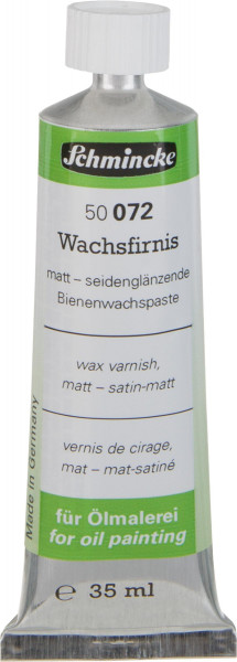 Tubenpaste zur Oberflächenbehandlung gut durchgetrockneter Ölbilder. Am besten mit dem Handballen oder einem nicht flusenden Tuch dünn verreiben. Das Bild erhält einen schützenden matten Wachsüberzug, der durch Bürsten seidenglänzend wird. Auftrag kann nach 8–12 Monaten erfolgen. Enthält: Bienenwachs, Dammar, Testbenzin.