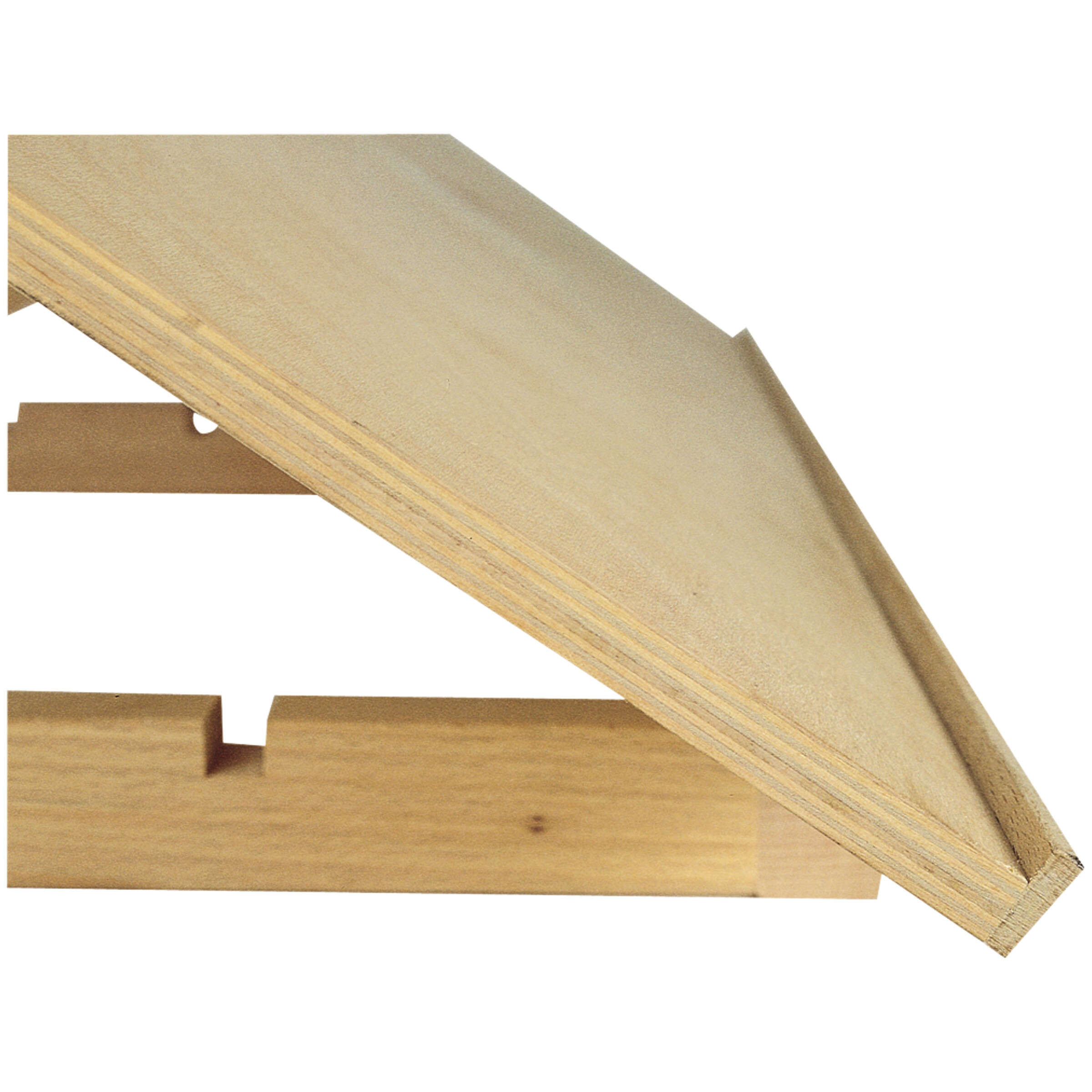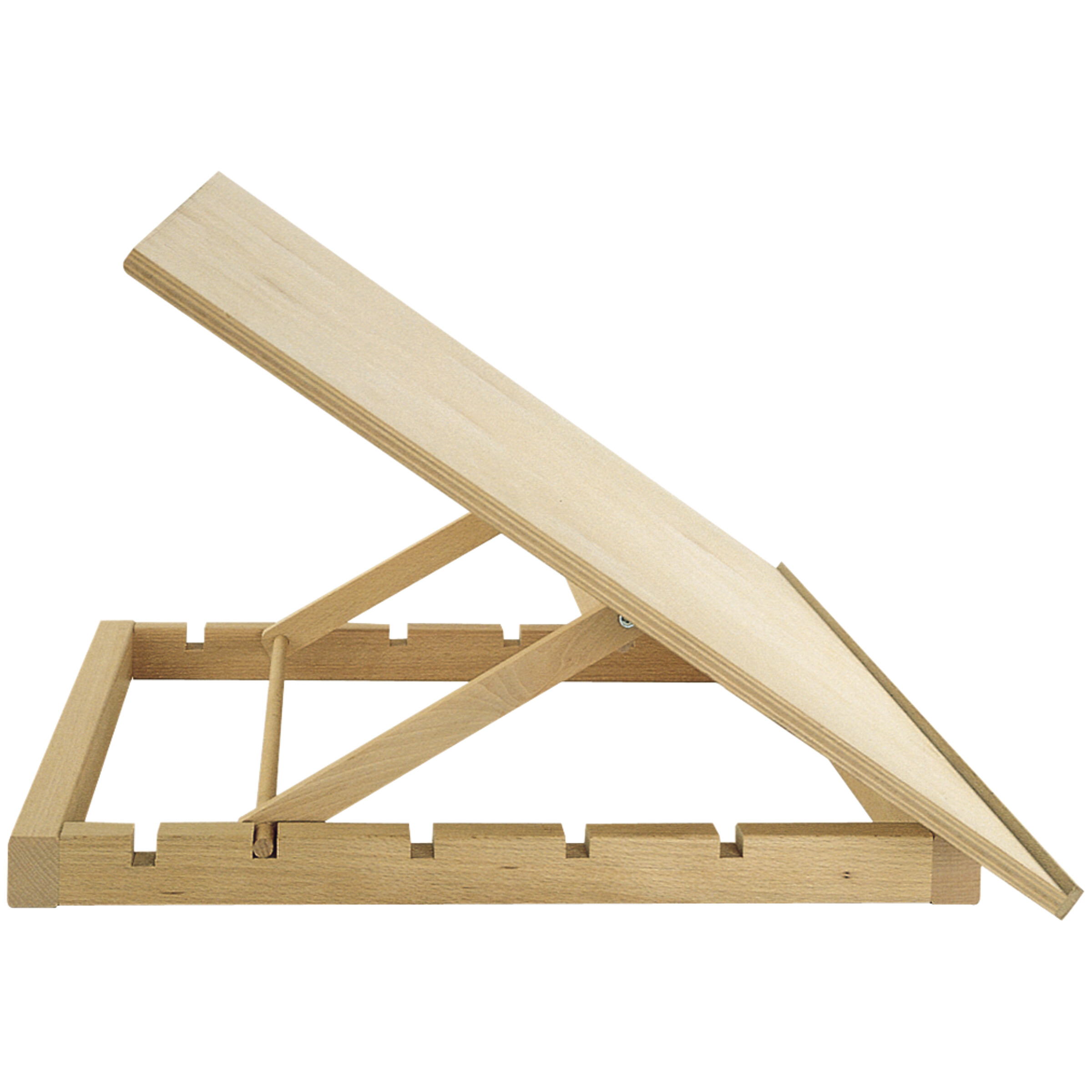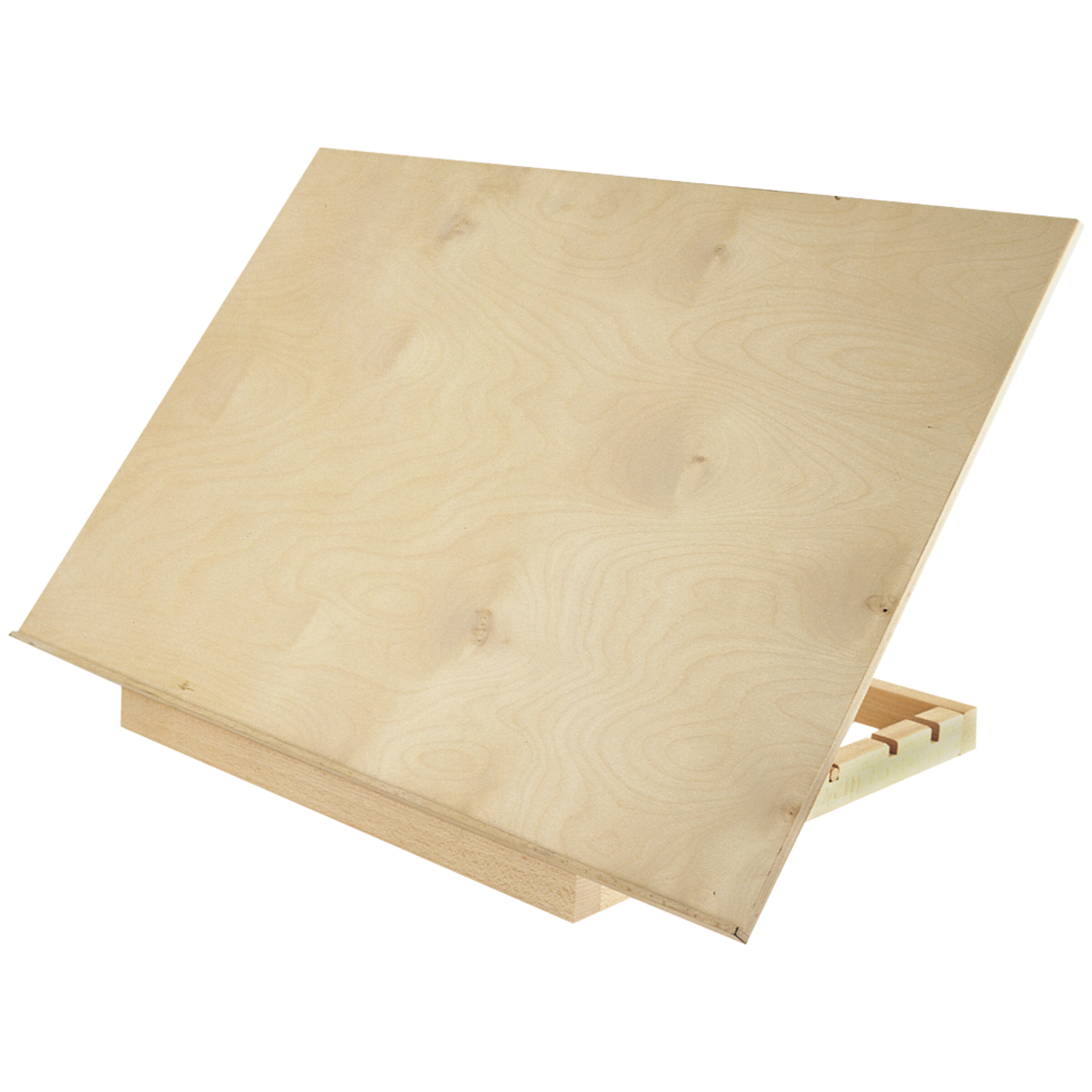 Pappelsperrholzplatte, natur, 10 mm stark. Das stabile Zeichenbrett kann in fünf verschiedene Neigungswinkel verstellt werden. Sehr solide Ausführung aus Schreinerhand.