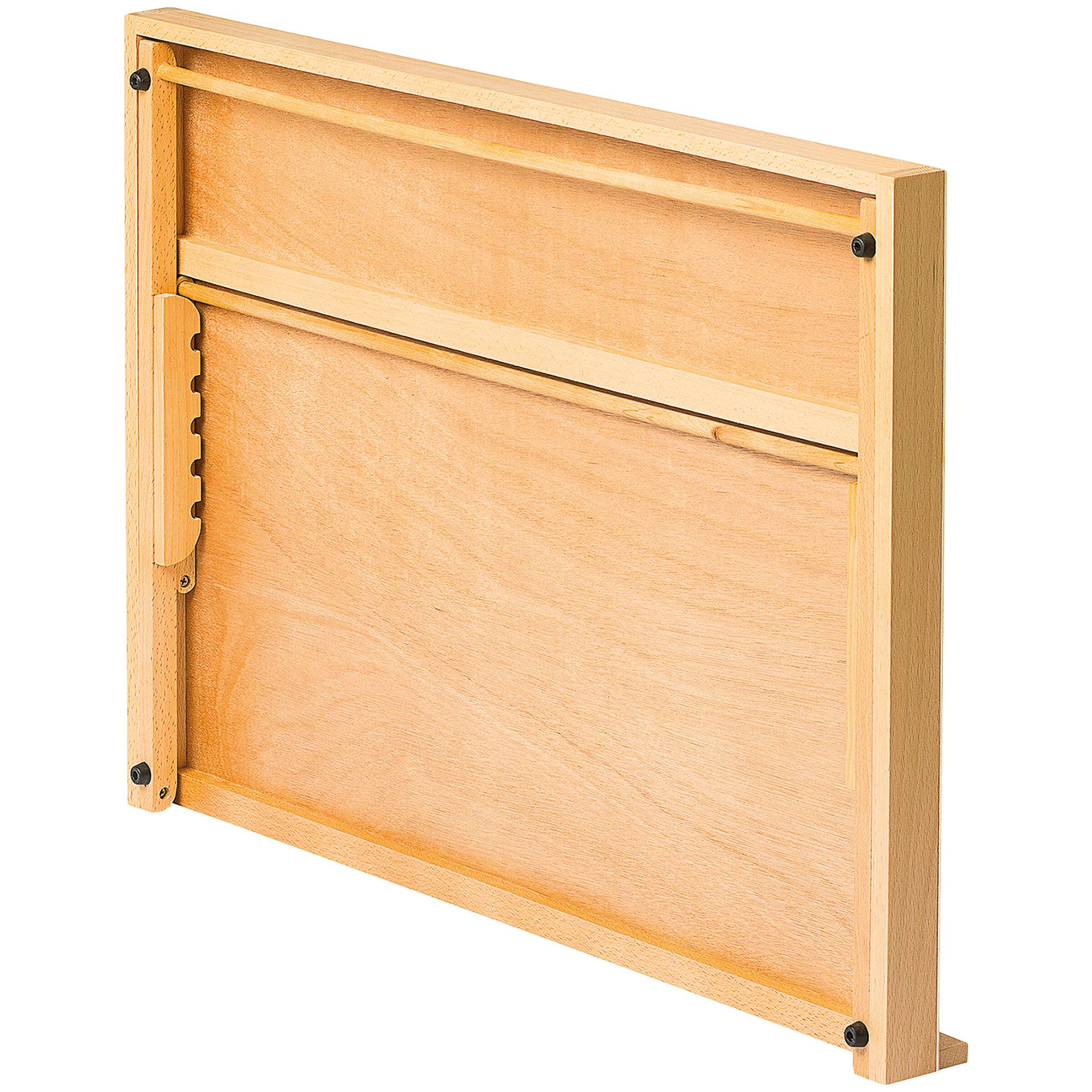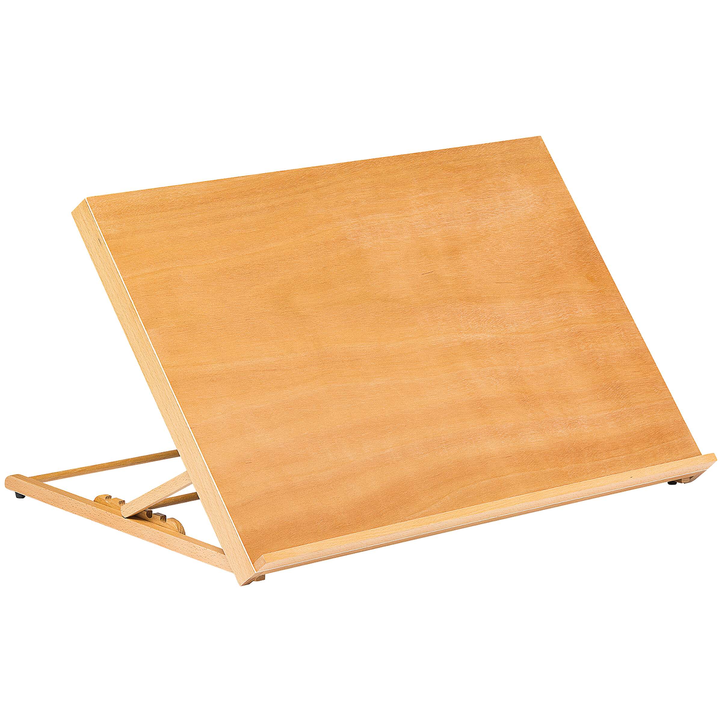 Das neigungsverstellbare Zeichenbrett mit einem Rahmen aus massivem Buchenholz bietet eine stabile Grundlage für die zeichnerische Arbeit. Die Arbeitsfläche ist in 5 (bei der kleineren Ausführung in 4) Neigungswinkeln verstellbar und erlaubt eine vielfache senkrechte oder horizontale Nutzung, wahlweise auch als Tisch-Staffelei für andere Maltechniken. Papier, Karton oder Keilrahmen finden auf der Auflagefläche mit Ablage sicheren Halt, für einen festen Stand sorgen rutschfeste Füße.
