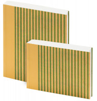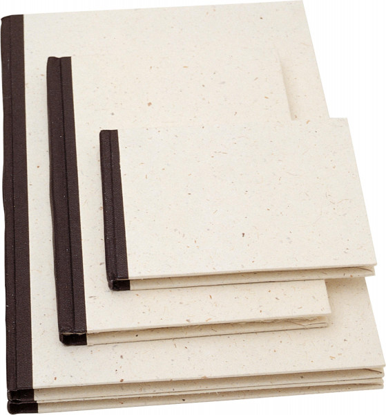 Büttenpapier aus 100 % Baumwolle. Bei den Formaten DIN A4/A5 hat das Papier, im Nasszustand gerissen, einen Büttenrand; das Format DIN A6 hat keinen Büttenrand. Der Buchrücken ist mit schwarzem Baumwollgewebe eingefasst. Das...